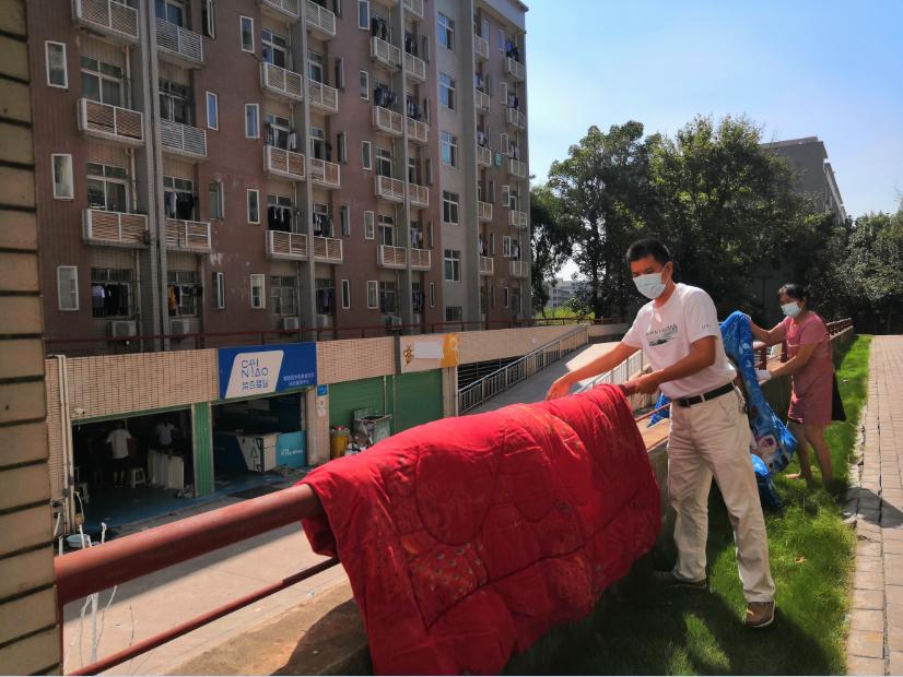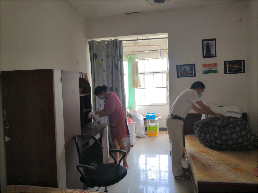 “因疫情原因,留学生未返校达一年多之久,寝室内衣物等积有灰尘,少许还有霉斑”。针对这一问题,机关党委第十四党支部所辖部门外事办、国际教育学院全体教职工自5月份以来,在与留学生充分沟通到位基础上,积极主动多次开展了主题为“我为群众办实事”的志愿活动,为未返校留学生整理寝室衣物、除“四害”、晾晒衣服。