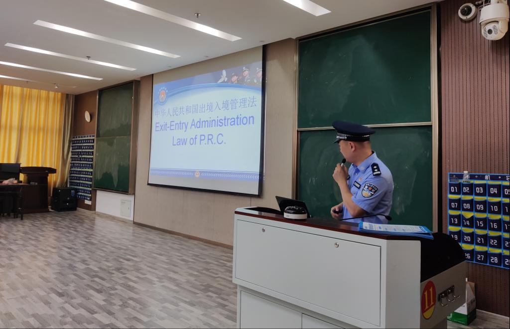 其后,蓉江新区出入境民警向来华留学生们介绍了《中华人民共和国出入境管理法》,着重讲解了涉及留学生的法律条款,如临时住宿登记、签证类型、外国人违法情况和处罚措施等等,借助大量的违法案列,有效地帮助留学生树立遵纪守法的意识。出入境民警还要求留学生们要切实遵守中国法律法规,珍惜在中国留学的机会,学有所成,成为一名中外文明交流的使者。