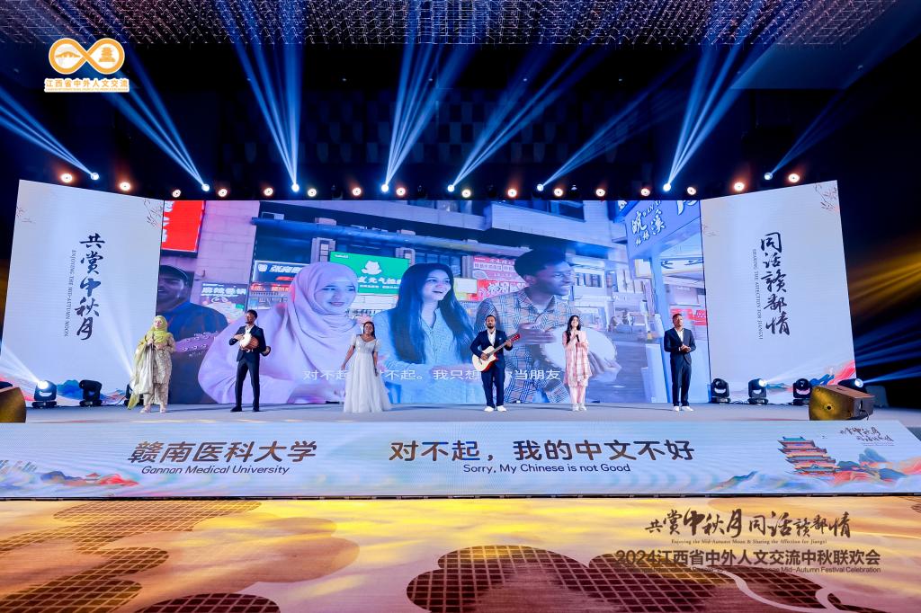 外国留学生汉语大赛已在我省内成功举办十一届,大赛目的是以汉语为媒介,以来华留学生为桥梁,讲好江西故事,展现汉语言文化魅力。通过在赣留学生亲身体验和感悟,展示我省留学生教育教学成果,提升留学生汉语言能力,促进中外文化交流。此次比赛内容包括汉语演讲、才艺展示和中国文化知识问答等环节。才艺展示比赛环节,我校精心准备了歌舞表演节目《对不起,我的中文不好》,欢快的旋律,朗朗上口的歌词,将现场的评委和其他选手们深深吸引。虽然他们的汉语发音存在一定瑕疵,但是他们的独特演绎和生动活泼的风采,传递了中国文化的魅力,也构建了中外文化、语言与艺术的沟通桥梁。值得一提的是在2024年中外人文交流中秋联欢会上,我校的歌舞节目《对不起,我的中文不好》再次被省教育厅选中,在省内外领导嘉宾及全省中外学生面前表演,学生们的成功表演赢得现场阵阵喝彩。