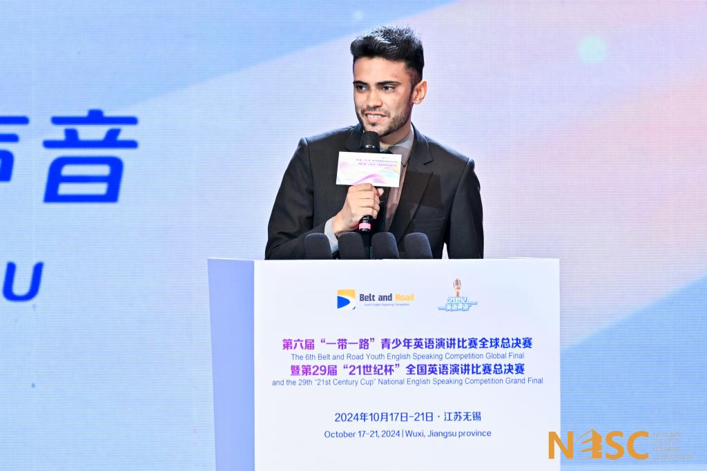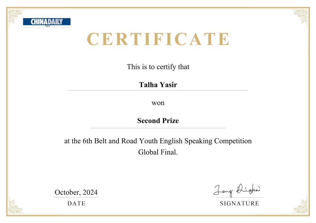 近日,由中国日报社主办的第六届“一带一路”全球青少年英语演讲总决赛在江苏无锡圆满落幕。我校2021级巴基斯坦留学生TALHA YASIR凭借其出色的英语水平和精彩的演讲内容,成功斩获大赛二等奖,而且在闭幕会上作为学生代表发言,为学校赢得了荣誉。