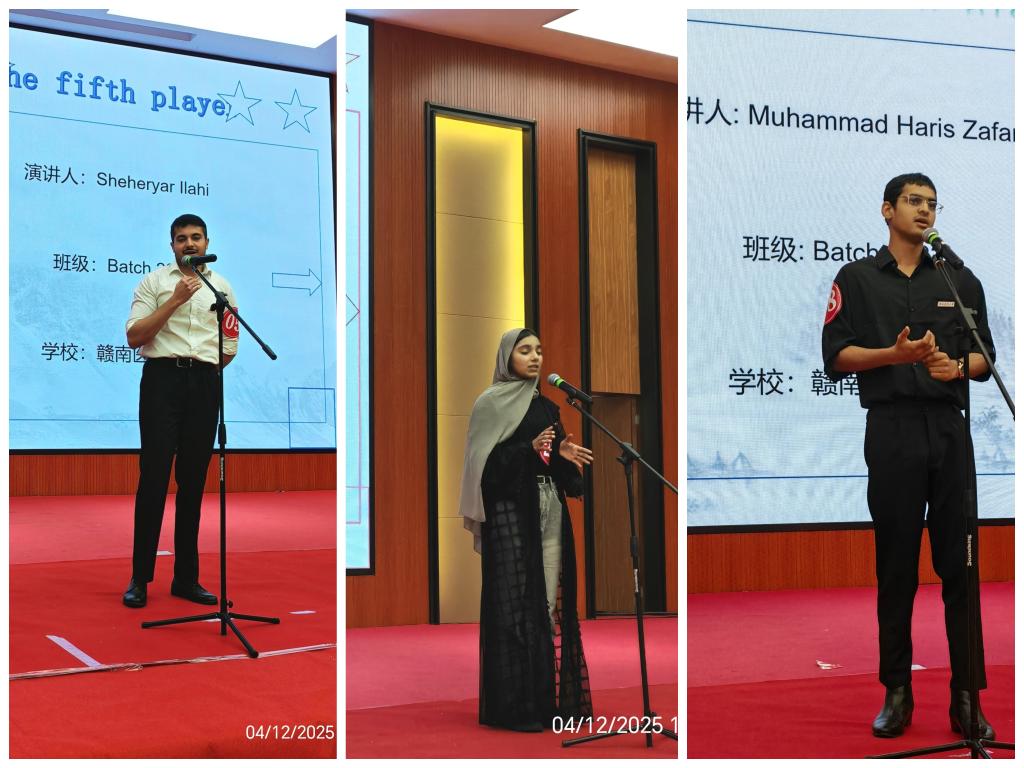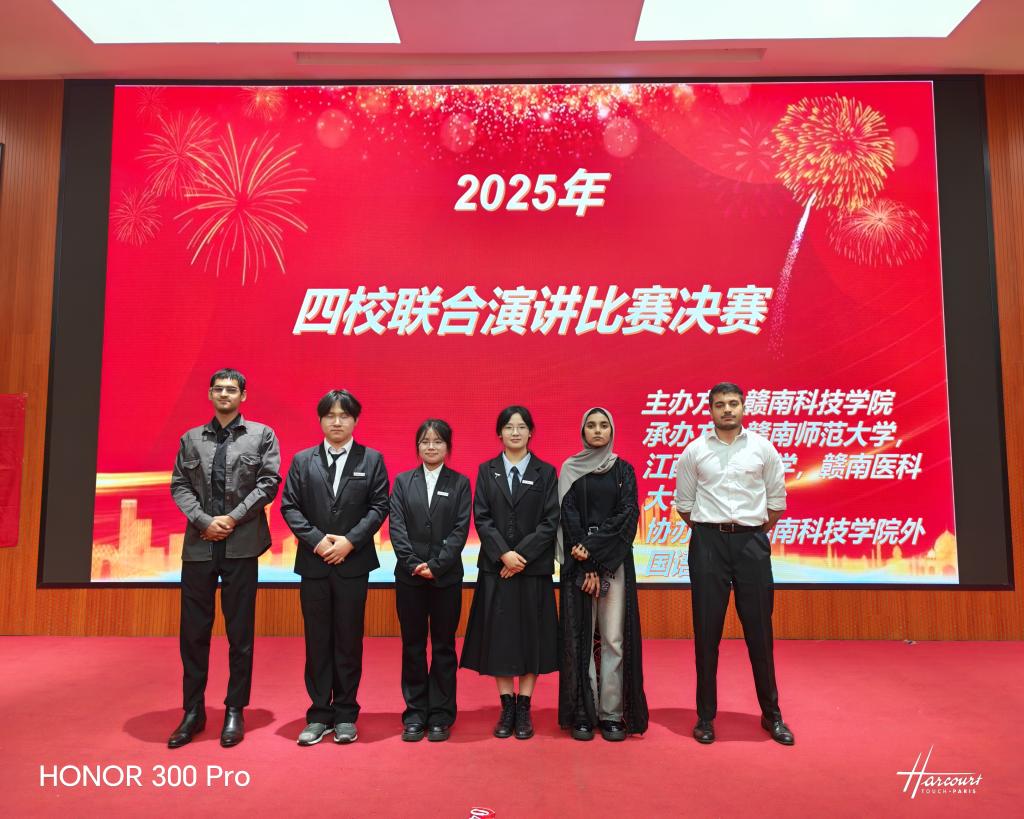 2025年4月12日,由赣南科技学院主办的四校联合英语演讲比赛决赛,在赣南科技学院图书馆汇报厅成功举办。我校、赣南科技学院、江西理工大学及赣南师范大学四所高校在初赛后,分别推选6名优秀学生晋级决赛,一共24名选手同台竞技。最终,我院2022级的巴基斯坦来华留学生SHEHERYAR ILAHI和MUHAMMAD HARIS ZAFAR凭借出色的英语语言能力与跨文化视角脱颖而出,此次比赛特等,来自2024级的SAMEENA FAZAL获得比赛二等奖。