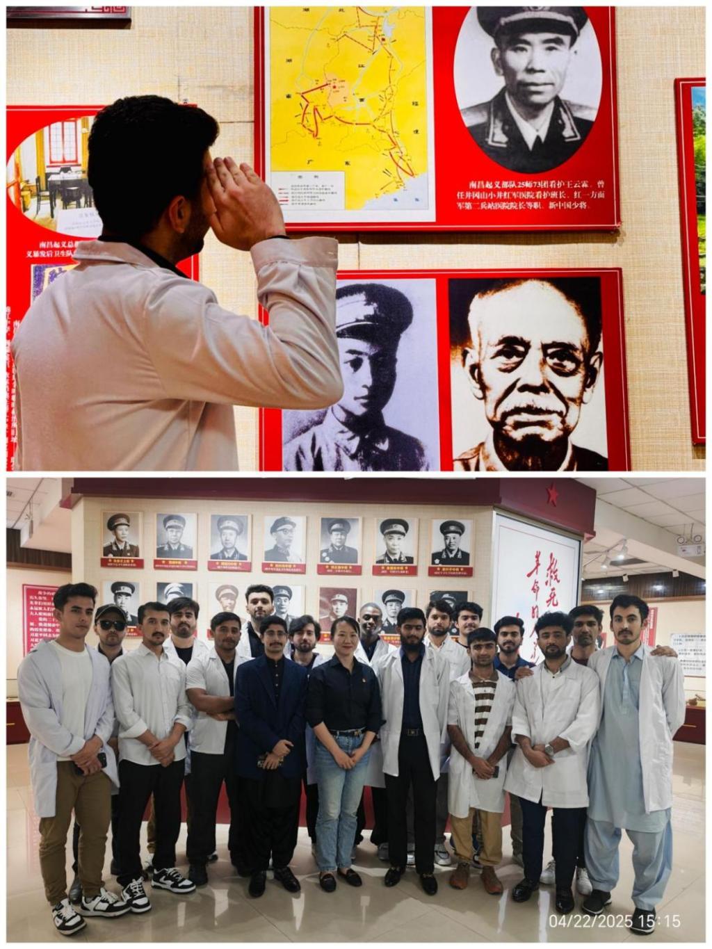 在红医馆里,留学生们跟随讲解员的脚步,通过珍贵的历史文物、图片和场景复原,学习了中央苏区时期红军医疗卫生事业艰苦卓绝的发展历程。来自巴基斯坦的SHAH AHMAD KHAN同学在参观后,对红军报以军礼,他说"红军医生在艰苦条件下救死扶伤的故事让我深受感动,这种奉献精神值得我们每个医学生学习。