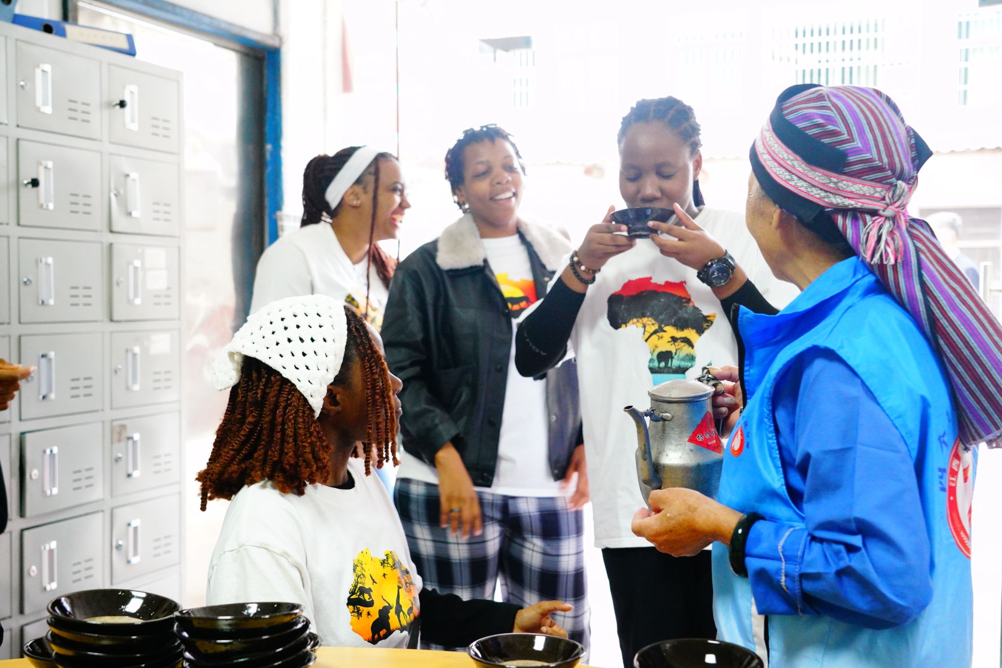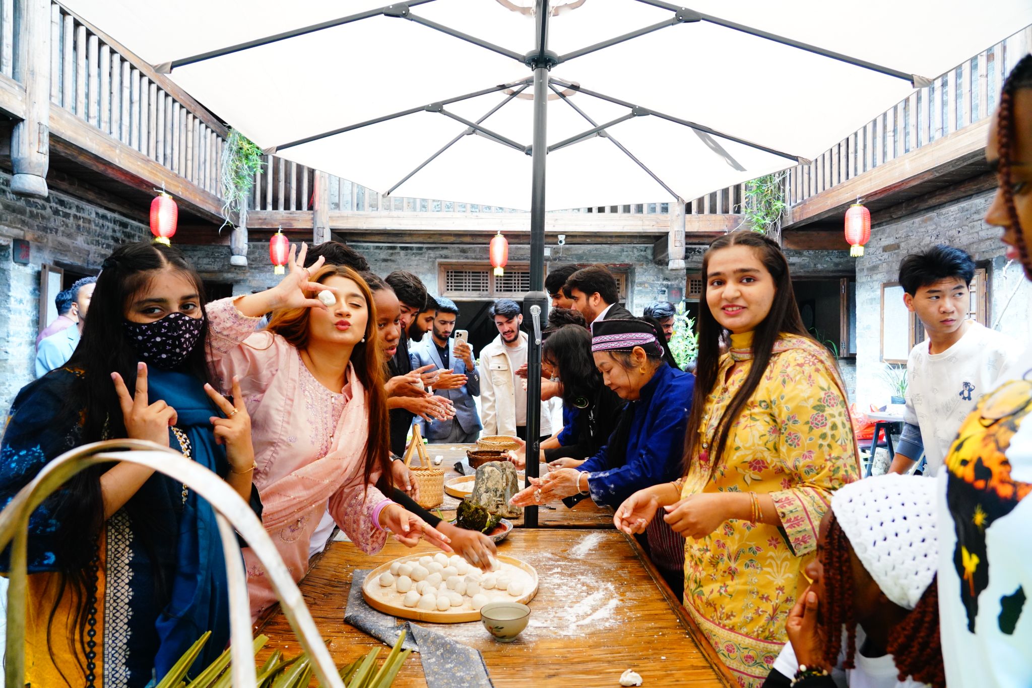 在杨村镇,学生们亲手制作了客家传统小吃芒杆粄,从和粉到压模,在劳动的乐趣中品味“舌尖上的客家”。他们走进被誉为“东方城堡”的燕翼围,宏伟的建筑与精妙的防御设计,令大家深刻感受到客家人结协作、慎终追远的家族智慧。留学生们还与村民热情共舞,现场气氛活跃。