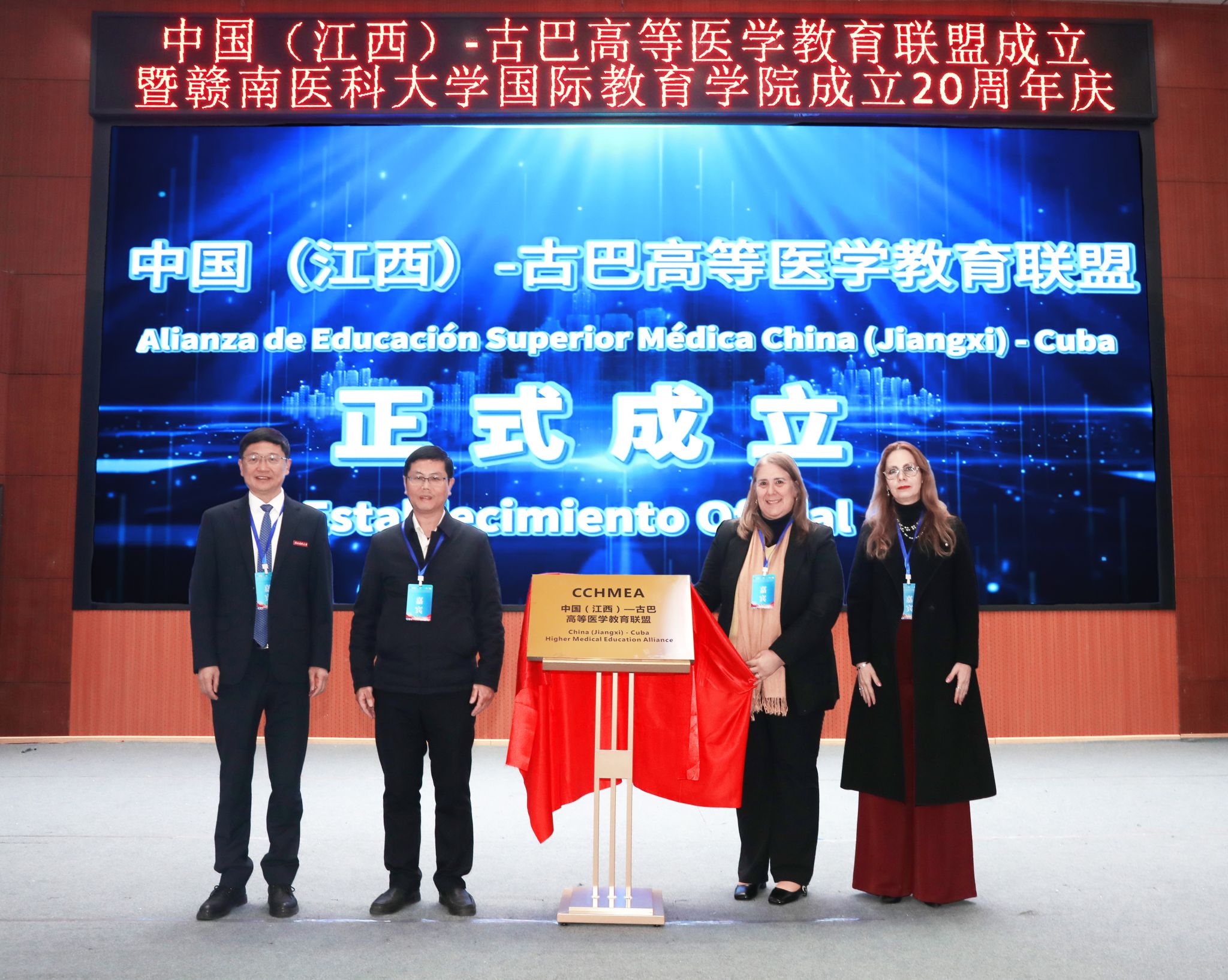 约安德拉·穆罗·巴列(Yoandra Muñoz Valle)博士、艾琳(AILEEN DIAZ BERNAL)女士、王勇、张小康共同为中国(江西)—古巴高等医学教育联盟揭牌。红绸缓缓落下,标志着中国(江西)—古巴高等医学教育联盟正式成立。