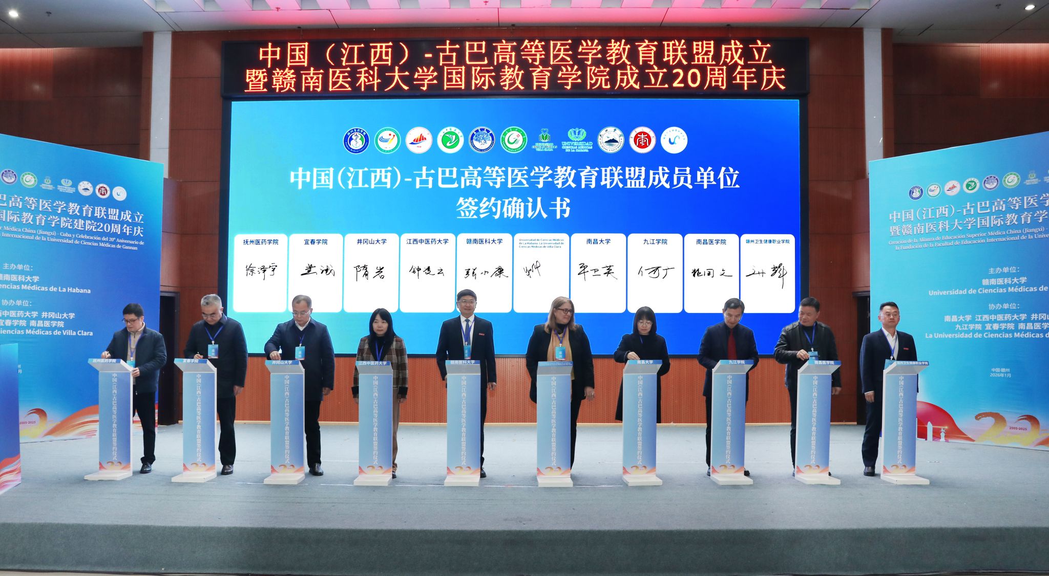 在现场嘉宾的共同见证下,约安德拉·穆罗·巴列(Yoandra Muñoz Valle)博士、张小康以及南昌大学、江西中医药大学、井冈山大学、宜春学院、南昌医学院、抚州医药学院、九江学院、赣南卫生健康职业学院等单位代表共同上台在中国(江西)—古巴高等医学教育联盟成员单位签约确认书上签字。